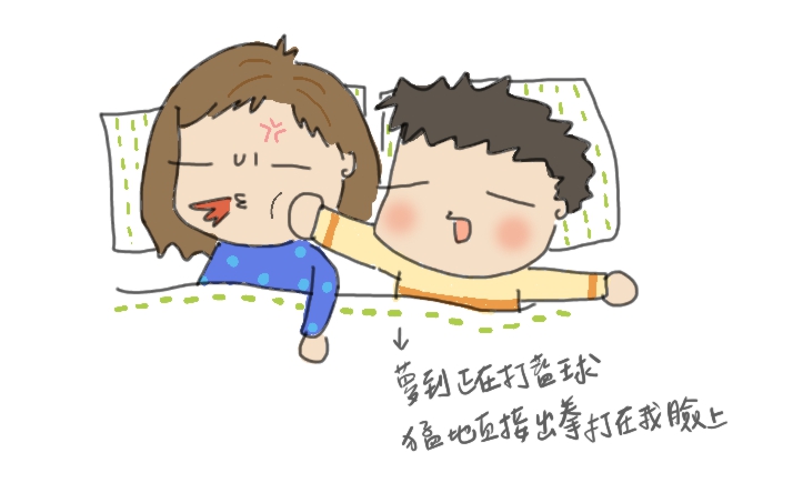 說到睡覺,旁邊睡一個老公真的跟以前自己睡很不一樣。某天晚上飛飛疑似做夢,手超。用。力。一拳打在我臉上,我睡到一半被敲醒(?)嚇一跳,但秒睡王也是名不虛傳,我就那一秒醒來說「怎麼了」下一秒又睡去(上班到底多累)。隔天我突然想到這件事,問飛飛:「欸你昨天做夢好像打了我一下?」飛飛說:「喔靠,對椰,因為我夢到我在打籃球,正在接關鍵的一球」請問是多關鍵?!得幾分?!